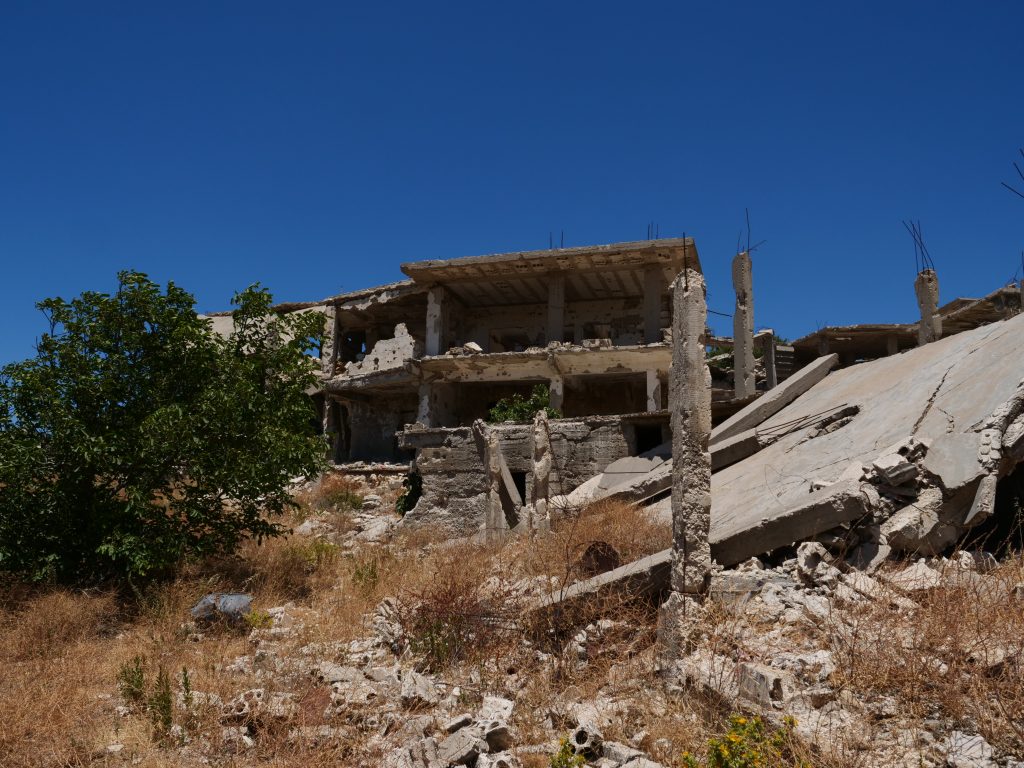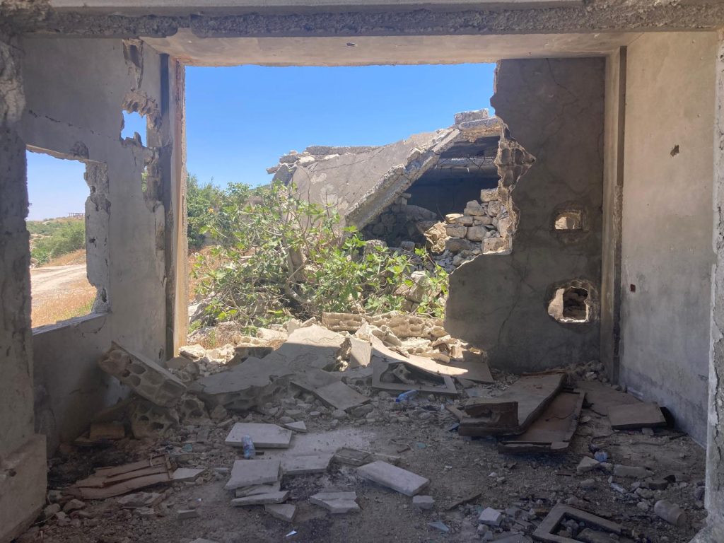 Even 8 months after liberation, almost no one had returned to Jabal al-Akrad. Only those with partially fixable houses had begun the long journey back to the mountains. A few men from these families sleep under tarps strung between broken walls as they rebuild, brick by brick, a single room in an otherwise uninhabitable house. In Kinsabba, a few Christian families have begun to return – new roof tiles can be seen along their houses and the town’s church, which had been destroyed by regime jets.