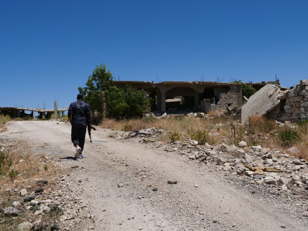 A police officer, a local from Jabal al-Akrad, walks up Kabineh’s main road. // Photo credit: Nicholas Waters