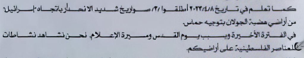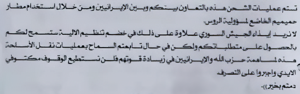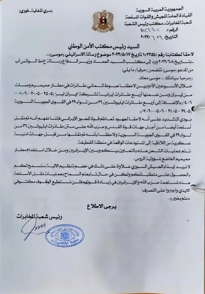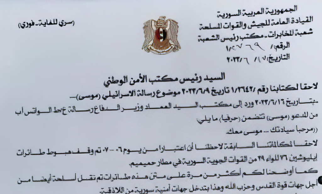 “Syrian Arab Republic, General Staff of the Armed Forces, Secret Service Division Office of the Chief of the Secret Service: On the 16th of June, 2022, a Whatsapp message was received by the office of the Minister of Defense from the so-called “Moses” the literal content of the letter is as follows: ‘Good day your Excellency, this is Moses. Following our previous conversation, we have noticed that since the 6th and 7th, we have stopped two IL-76 aircraft belonging to the 29th Brigade of the Syrian Air Force from landing in Hmeimim airport. As we have told you time and time again, these airplanes are transporting weapons, also to the Quds Force and Hezbollah. This is being done with the intervention of Syrian Security Forces from Latakia.”