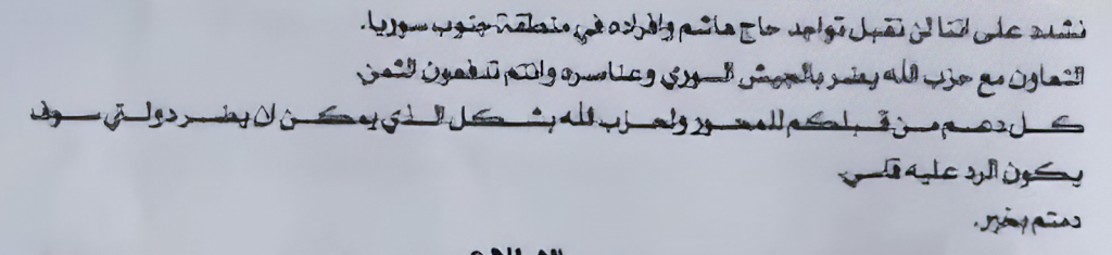 “We reiterate that we will not accept the presence of Haj Hashem (Hashem Safieddine, Hezbollah’s second-in-command at the time) and the members of his group in the area of northern Syria. Cooperation with Hezbollah harms the Syrian army and its members. You are paying the price of all the support you provide to the Axis and Hezbollah in ways that can damage my country, and the response will be very harsh. All the best.”